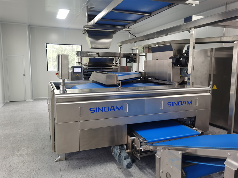 面團通過疊層機三次壓軋,切片疊加至8~16層面皮。輸送至成型軋輥,該機能將回面始終處于面 皮底部,經(jīng)切片式疊層機生產(chǎn)出來的餅干層次感 強、口感松脆、酥化程度極高,配合機器上的撒 酥機,可生產(chǎn)蘇打餅干和其它高檔餅干。